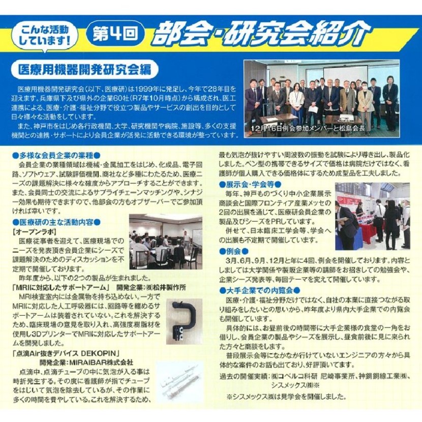 当社は、神戸市機械金属工業会の部会「医療用機器開発研究会」の会員企業です。
